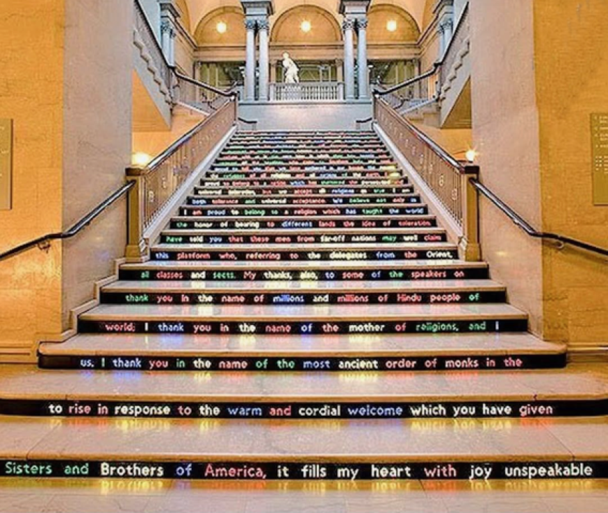 Nous nous souvenons que dans ce lieu, en 1893,  Swami Vivekânanda bouleversait le Parlement mondial des religions par un appel ardent à la fin du fanatisme.