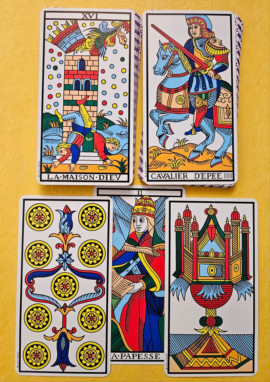 La Maison Dieu et le Cavalier d’Épée : nous quittons un processus de lâcher prise "actif". Tirage conseil : la Papesse, Neuf de Deniers et As de coupe. Prenons le temps de laisser mûrir ce qui a été bouleversé.