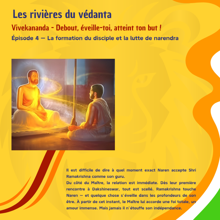 Il est difficile de dire à quel moment exact Naren accepte ShriRamakrishna comme son guru.Du côté du Maître, la relation est immédiate. Dès leur première rencontre à Dakshineswar, tout est scellé. Ramakrishna touche Naren - et quelque chose s'éveille dans les profondeurs de son être. À partir de cet instant, le Maître lui accorde une foi totale, un amour immense. Mais jamais il n'étouffe son indépendance.
