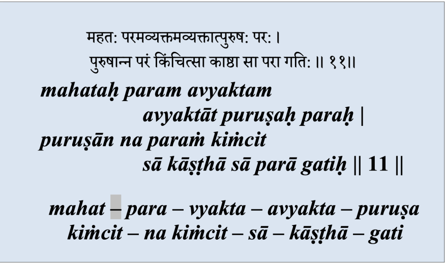 Pour affiner notre compréhension, Yama nous entraîne dans une recherche de plus en plus subtile : les objets sont supérieurs aux sens, le manas est supérieur aux objets, la buddhi est supérieure au manas, le grand ātman est supérieur à la buddhi, le non-manifesté est supérieur au grand ātman, le puruṣa est supérieur au non-manifesté, il n’y a rien de supérieur au puruṣa, c’est le sommet !