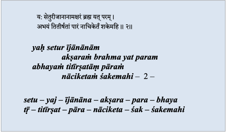 Les rites, les sacrifices et les actions en général, la méditation, le désir de libération, sont comme un pont qui mène au suprême brahman, à l’autre rive où règne l’absence de peur.