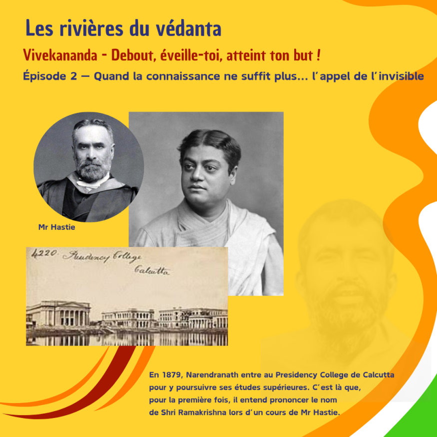 En 1879, Narendranath entre au Presidency College de Calcutta pour y poursuivre ses études supérieures. C'est là que, pour la première fois, il entend prononcer le nom de Shri Ramakrishna lors d'un cours de Mr Hastie.