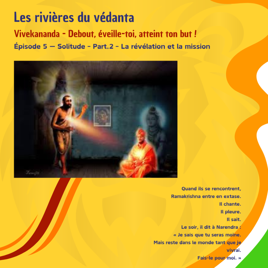 Quand ils se rencontrent,Ramakrishna entre en extase.Il chante.Il pleure.Il sait.Le soir, il dit à Narendra :« Je sais que tu seras moine.Mais reste dans le monde tant que je vivrai.Fais-le pour moi. »