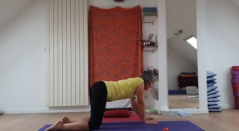 Nous pratiquons marjariasana (dos rond, dos creux) sur les avant-bras pour continuer à délier le dos et la colonne. Explorons cette posture qui est aussi une posture inversée, dirigeons le souffle et cherchons uddhyana bandha pour aller libérer les tensions et les douleurs. Belle pratique.